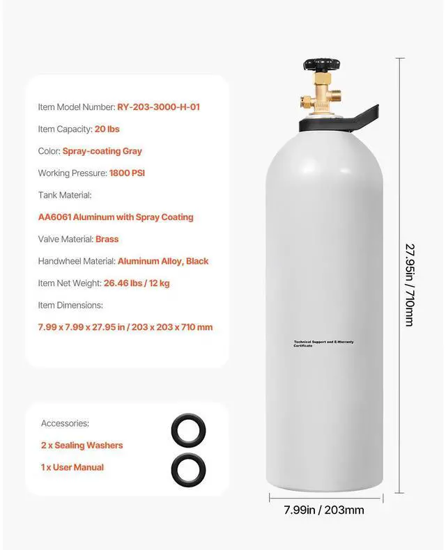 Working Pressure: 1800 PSI Design, Works 3000 PSI,Color: Spray-coating Gray,Item Model Number: RY-203-3000-H-01,Handwheel Material: Aluminum Alloy, Black,Item Net Weight: 26.46 lbs / 12 kg,Item Dimensions: 7.99 x 7.99 x 27.95 in / 203 x 203 x 710 mm,Tank Material: AA6061 Aluminum with Spray Coating,Item Capacity: 20 lbs,Valve Material: Brass