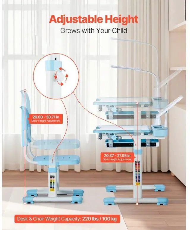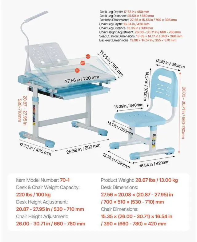 Desk Height Adjustment: 20.87 - 27.95 in / 530 - 710 mm,Chair Height Adjustment: 26.00 - 30.71 in / 660 - 780 mm,Chair Dimensions: 15.35 x (26.00 - 30.71) x 16.54 in / 390 x (660 - 780) x 420 mm,Item Model Number: 70-1,Product Weight: 28.67 lbs / 13.00 kg,Desk Dimensions: 27.56 x 20.08 x (20.87 - 27.95) in / 700 x 510 x (530 - 710) mm,Desk & Chair Weight Capacity: 220 lbs / 100 kg