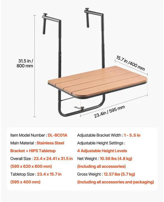 Tabletop Size: 23.4 x 15.7 in (595 x 400 mm),Gross Weight: 12.57 lbs (5.7 kg) (Including all accessories and packaging),Adjustable Bracket Width: 1 - 8.27 in,Item Model Number: DL-BC01A,Adjustable Height Settings: 4 Adjustable Height Levels,Overall Size: 23.4 x 24.41 x 31.5 in (595 x 620 x 800 mm),Net Weight: 10.58 lbs (4.8 kg) (Including all accessories),Main Material: Stainless Steel Bracket + HIPS Tabletop