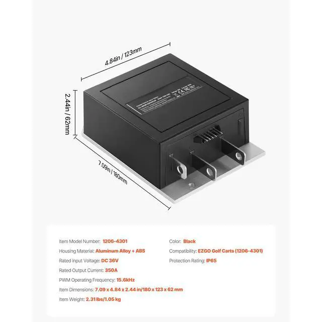 Protection Rating: IP65,Housing Material: Aluminum Alloy + ABS,Color: Black,Item Model Number: 1206-4301,Item Dimensions: 7.09 x 4.84 x 2.44 in/180 x 123 x 62 mm,Compatibility: EZGO Golf Carts (1206-4301),Rated Input Voltage: DC 36V,Item Weight: 2.31 lbs/1.05 kg,Rated Output Current: 350A,PWM Operating Frequency: 15.6kHz