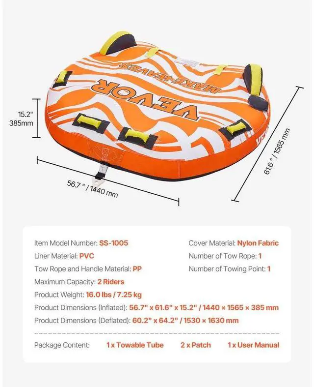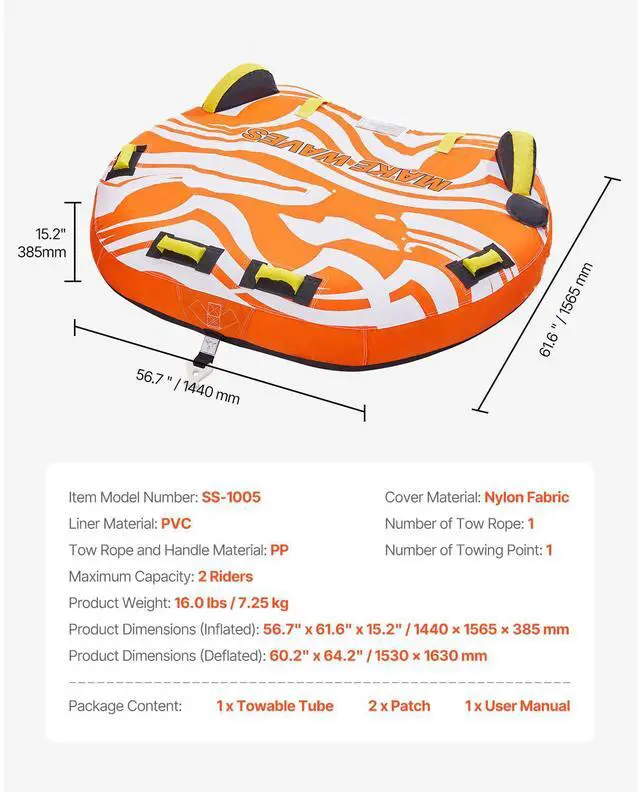 Number of Tow Rope: 1,Tow Rope and Handle Material: PP,Number of Towing Point: 1,Product Dimensions (Inflated): 56.7" x 61.6" x 15.2" / 1440 x 1565 x 385 mm,Item Model Number: SS-1005,Cover Material: Nylon Fabric,Maximum Capacity: 2 Riders,Product Weight: 16.0 lbs / 7.25 kg,Product Dimensions (Deflated): 60.2" x 64.2" / 1530 x 1630 mm,Liner Material: PVC