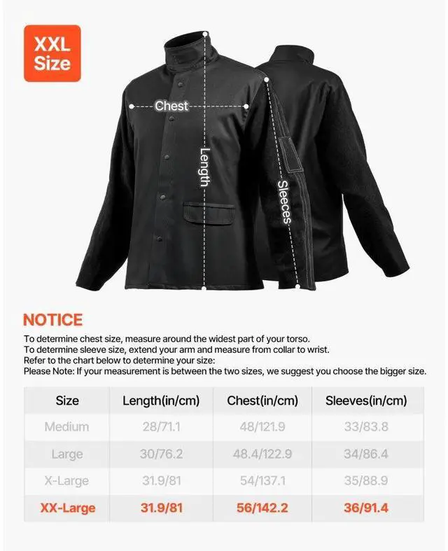 Chest: 56 in,Sleeve Length: 36 in,Size: XXL,Color: Black,Material: Cowhide Leather & Cotton,Flame-Resistant Material: Yes,Product Dimensions: 31.9 x 56.0 x 36.0 in / 810.1 x 1422.4 x 914.4 mm,Button Type: Snap Button,Length: 31.9 in,Item Model Number: AP-2530,Pockets: 2,Net Weight: 3.07 lbs / 1.39 kg,Arc Rating: ATPV 9.2 Cal/cm²