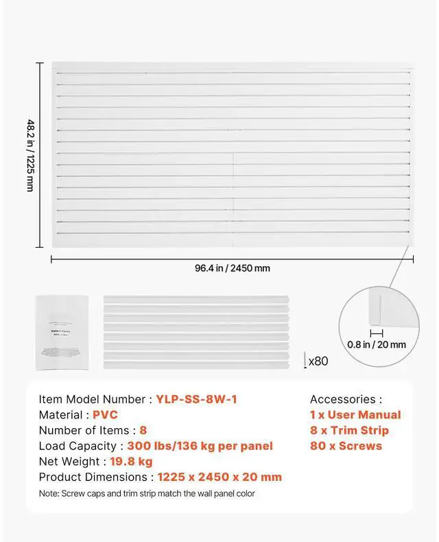 Item Model Number: YLP-SS-8W-2 Material: PVC Number of Items: 8 Load Capacity: 300 lbs/136 kg per panel Net Weight: 22 kg Product Dimensions: 1225 x 2450 x 20 mm