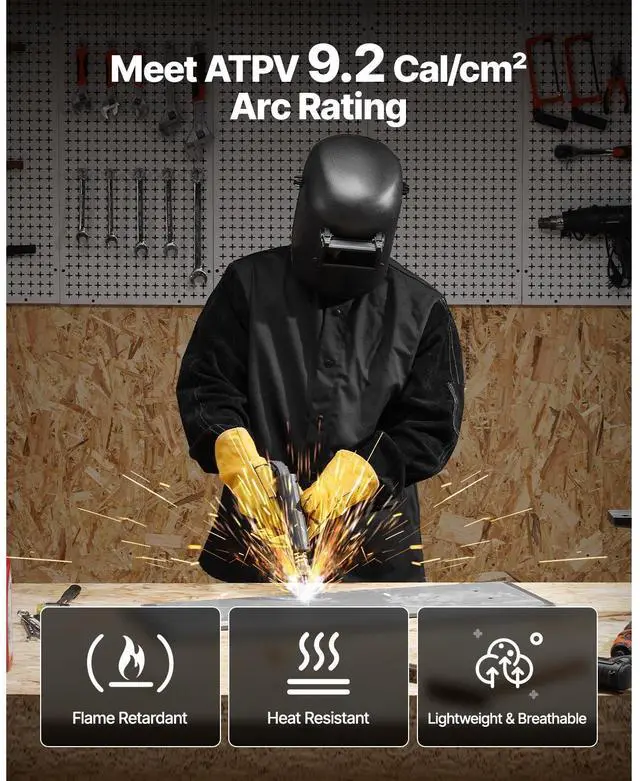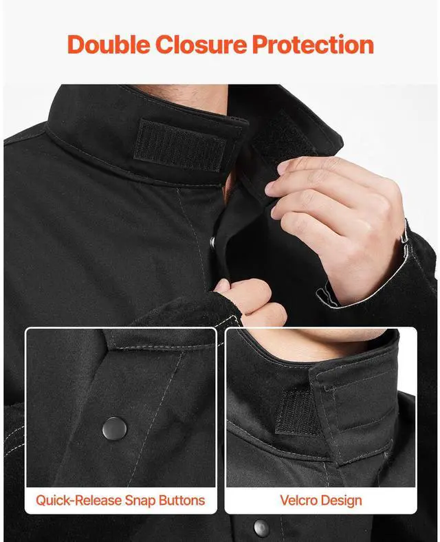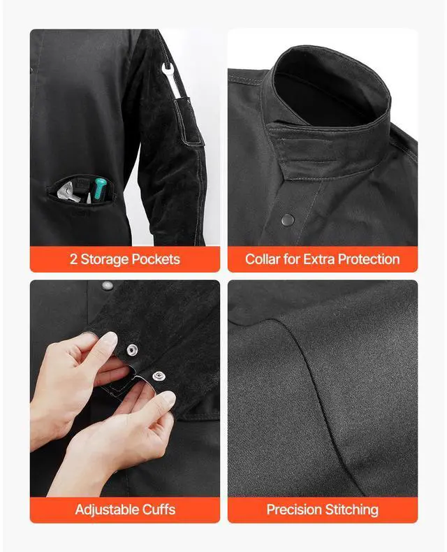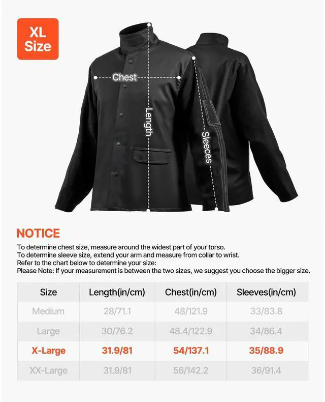 Chest: 54 in,Sleeve Length: 35 in,Size: XL,Color: Black,Material: Cowhide Leather & Cotton,Flame-Resistant Material: Yes,Product Dimensions: 31.9 x 54.0 x 35.0 in / 810.1 x 1371.6 x 889 mm,Button Type: Snap Button,Length: 31.9 in,Item Model Number: AP-2530,Pockets: 2,Net Weight: 2.75 lbs / 1.25 kg,Arc Rating: ATPV 9.2 Cal/cm²