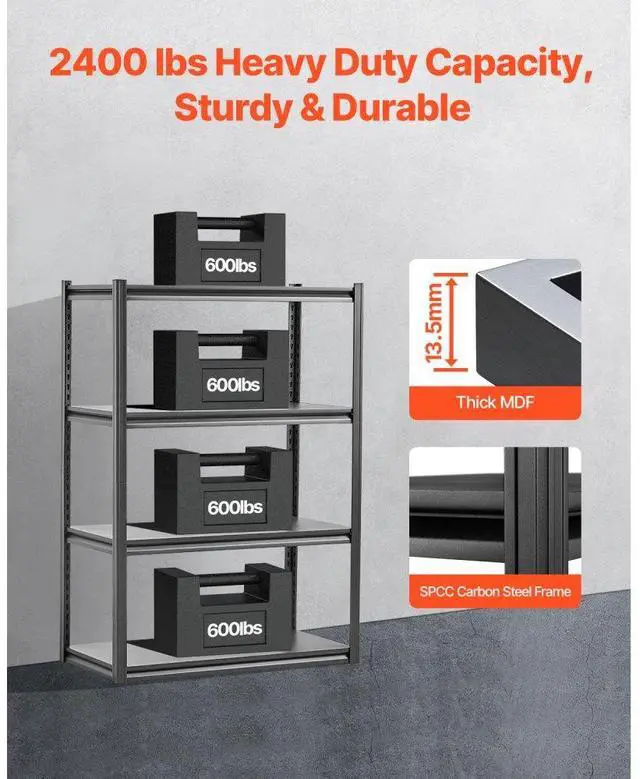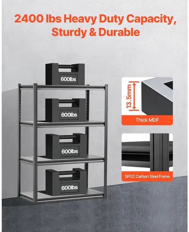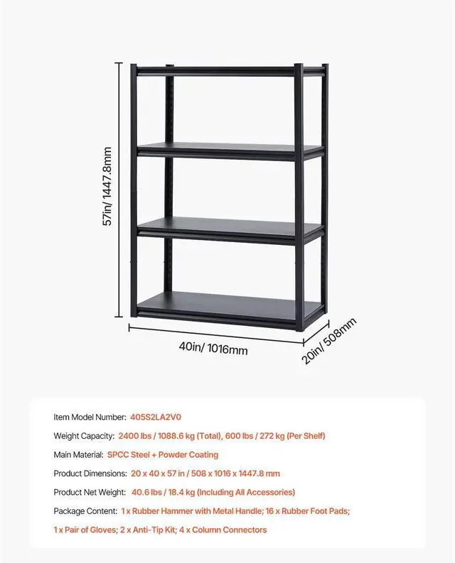 Weight Capacity: 2400 lbs / 1088.6 kg (Total), 600 lbs / 272 kg (Per Shelf),Item Model Number: 405S2LA2V0,Product Net Weight: 40.6 lbs / 18.4 kg (Including All Accessories),Product Dimensions: 20 x 40 x 57 in / 508 x 1016 x 1447.8 mm,Main Material: SPCC Steel + Powder Coating