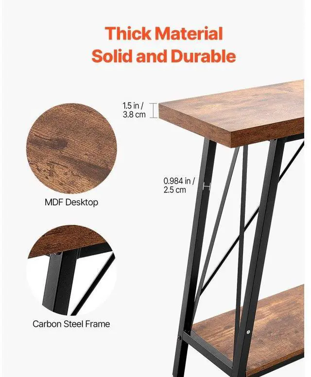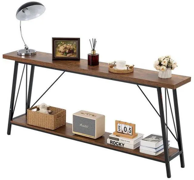 Bottom Shelf Size: 66.1 x 11.0 x 0.6 in / 168 x 28 x 1.5 cm,Number of Layers: 2 layers,Top Shelf Size: 70.9 x 11.8 x 1.5 in / 180 x 30 x 3.8 cm,Weight Capacity: 100 lbs / 45.3 kg,Foot Pads: Adjustable foot pads,Color: Brown + Black,Item Model Number: YJXXGZ-005,Frame Material: Carbon steel square tube,Frame Square Tube Size: 1.0 x 1.0 x 0.03 in / 25 x 25 x 0.8 mm,Product Dimensions: 70.9 x 11.8 x 31.5 in / 180 x 30 x 80 cm,Net Weight: 38.6 lbs / 17.75 kg,Shelf Material: MDF with melamine veneer