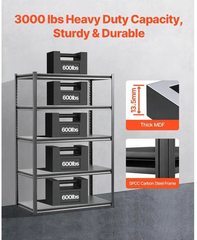 Weight Capacity: 3000 lbs / 1361 kg (Total), 600 lbs / 272 kg (Per Shelf),Item Model Number: 487H0A32V0,Product Net Weight: 60.9 lbs / 27.6 kg (Including All Accessories),Product Dimensions: 24 x 48 x 72 in / 609.6 x 1219.2 x 1828.8 mm,Main Material: SPCC Steel + Powder Coating