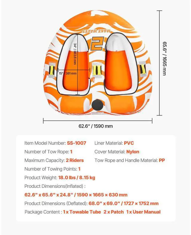 Number of Tow Rope: 1,Tow Rope and Handle Material: PP,Number of Towing Points: 1,Product Dimensions (Inflated): 62.6" x 65.6" x 24.8" / 1590 x 1665 x 630 mm,Item Model Number: SS-1007,Cover Material: Nylon,Maximum Capacity: 2 Riders,Product Weight: 18.0 lbs / 8.15 kg,Product Dimensions (Deflated): 68.0" x 69.0" / 1727 x 1752 mm,Liner Material: PVC
