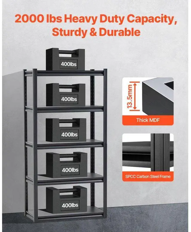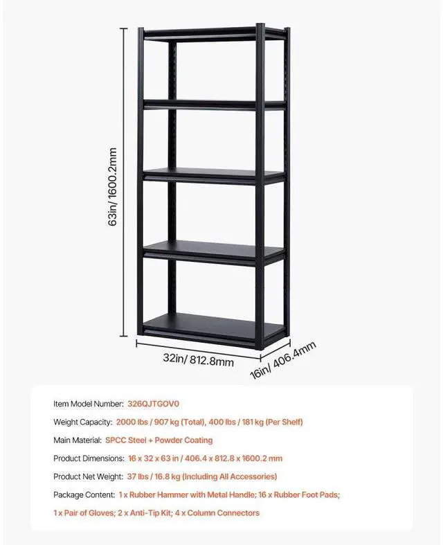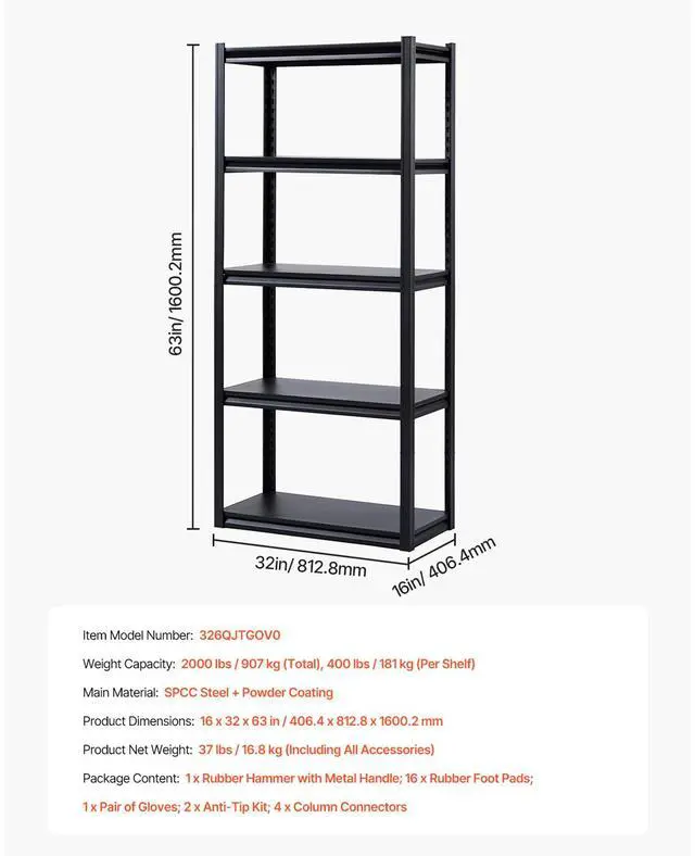 Weight Capacity: 2000 lbs / 907 kg (Total), 400 lbs / 181 kg (Per Shelf),Item Model Number: 326QJTGOV0,Product Net Weight: 37 lbs / 16.8 kg (Including All Accessories),Product Dimensions: 16 x 32 x 63 in / 406.4 x 812.8 x 1600.2 mm,Main Material: SPCC Steel + Powder Coating
