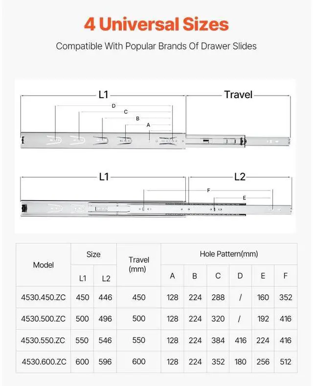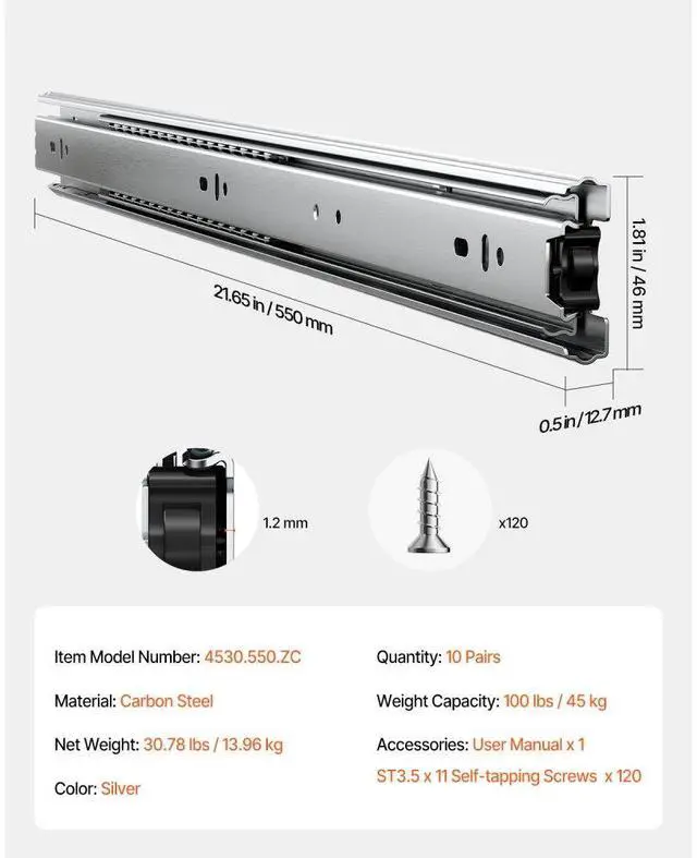 Weight Capacity: 100 lbs / 45 kg,Item Size: 21.65 x 1.81 x 0.5 inch / 550 x 46 x 12.7 mm,Color: Silver,Item Model Number: 4530.550.ZC,Quantity: 10 Pairs,Material: Carbon Steel,Net Weight: 30.78 lbs / 13.96 kg