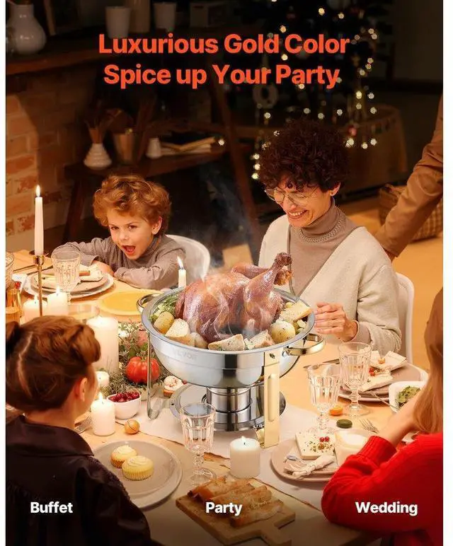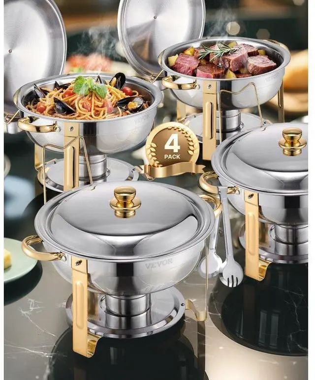 5 Qt 4 Pack Round Chafing Dish Buffet Set Full-Size Pan Stainless Steel Gold