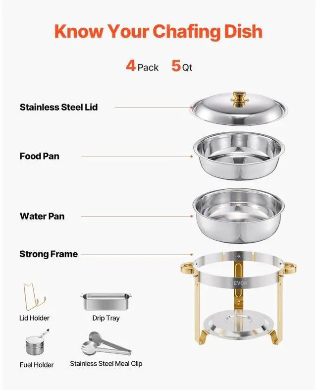 Food Pan Capacity: 5Qt / 4.7L,Water Pan Capacity: 7Qt / 6.6L,Color: Gold,Item Model Number: HZ-831,Product Weight: 23.6 lbs / 10.7 kg ±5 %,Quantity: 4,Material: Stainless Steel,Heating Method: Fuel