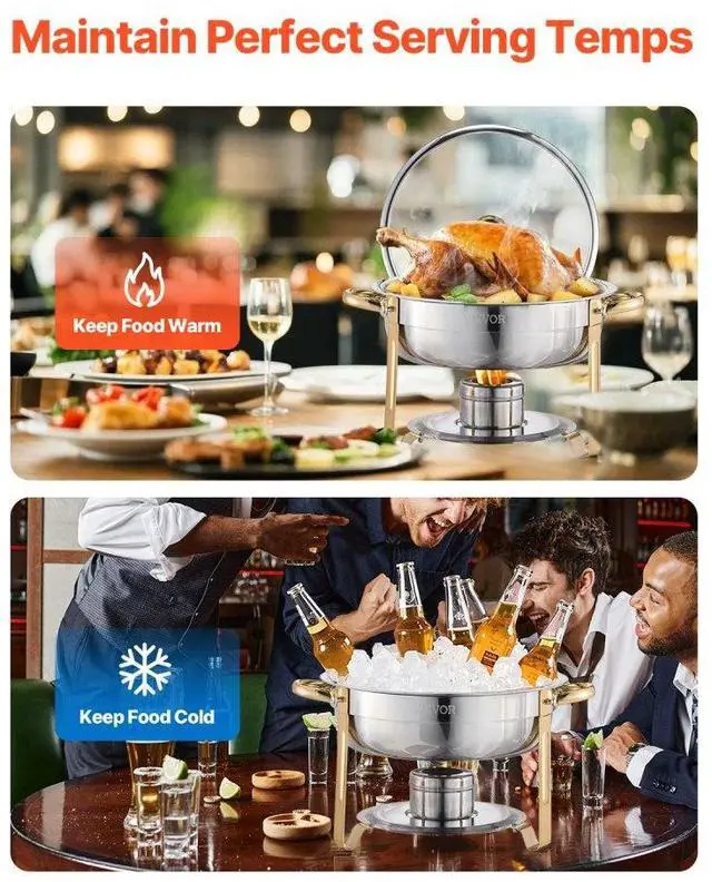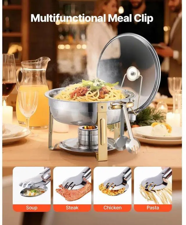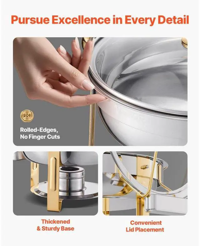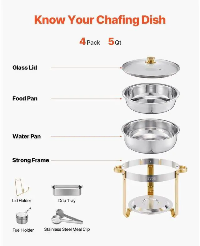 5 Qt 4 Pack Round Chafing Dish Buffet Set Full-Size Pan Stainless Steel Gold