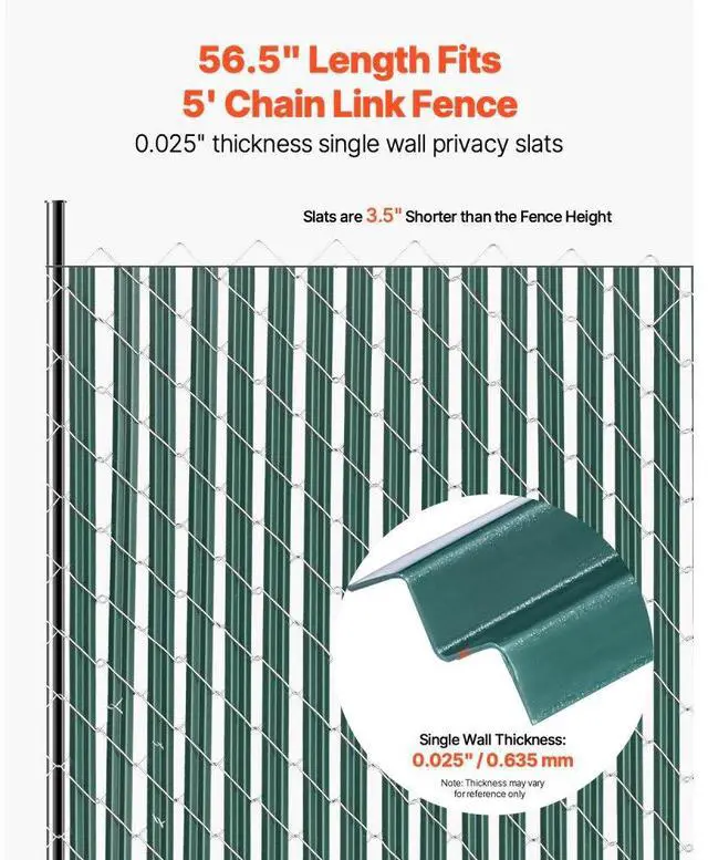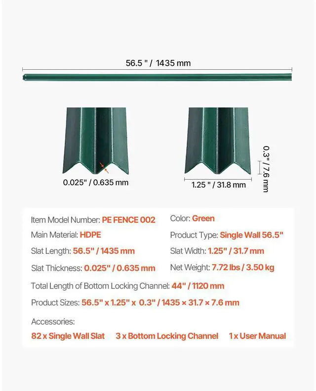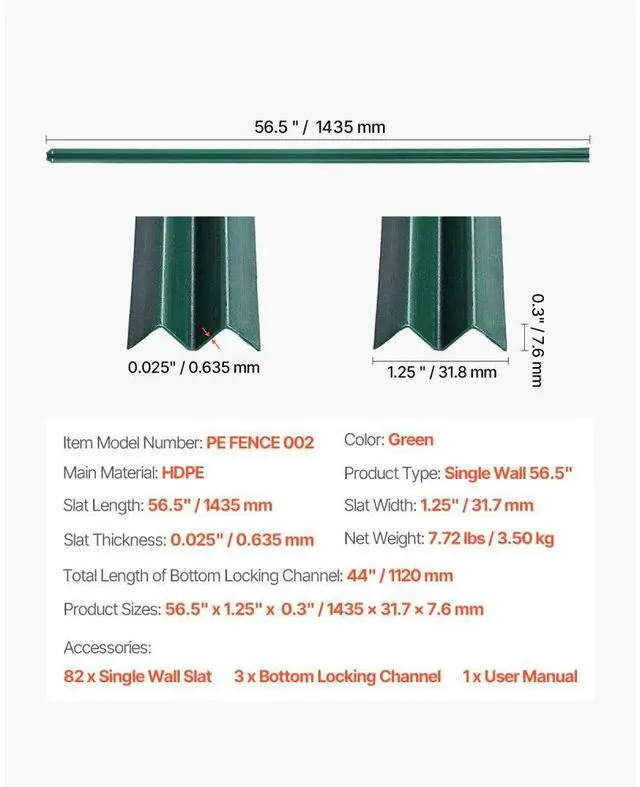 Slat Thickness: 0.025" / 0.635 mm,Product Sizes: 56.5" x 1.25" x 0.3" / 1435 x 31.7 x 7.6 mm,Product Type: Single Wall 56.5",Color: Green,Total Length of Bottom Locking Channel: 44" / 1120 mm,Item Model Number: PE FENCE 002,Slat Length: 56.5" / 1435 mm,Slat Width: 1.25" / 31.7 mm,Net Weight: 7.72 lbs / 3.50 kg,Main Material: HDPE