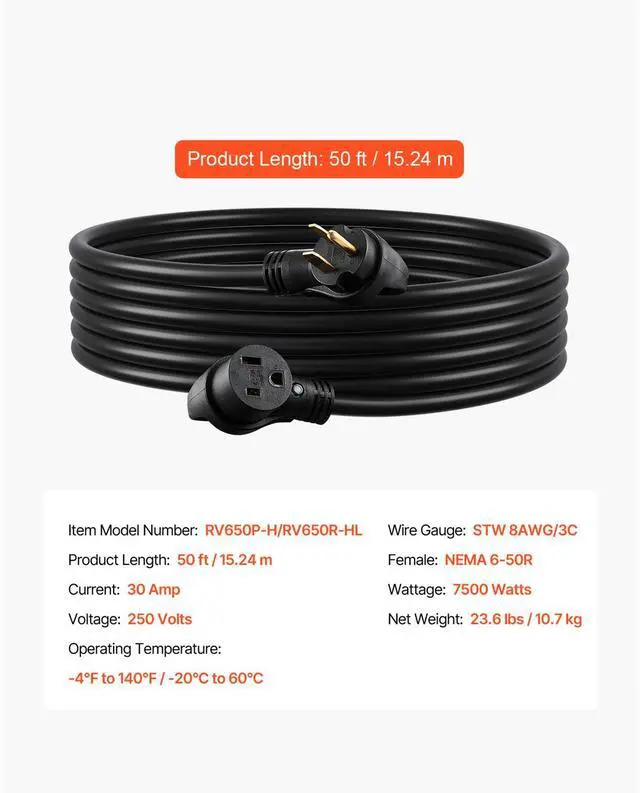 Operating Temperature: -4 to 140 / -20 to 60,Voltage: 250 Volts,Item Model Number: RV650P-H/RV650R-HL,Wattage: 7500 Watts,Product Length: 50 ft / 15.24 m,Female: NEMA 6-50R,Male: NEMA 6-50P,Current: 30 Amp,Wire Gauge: STW 8AWG/3C,Net Weight: 23.6 lbs / 10.7 kg