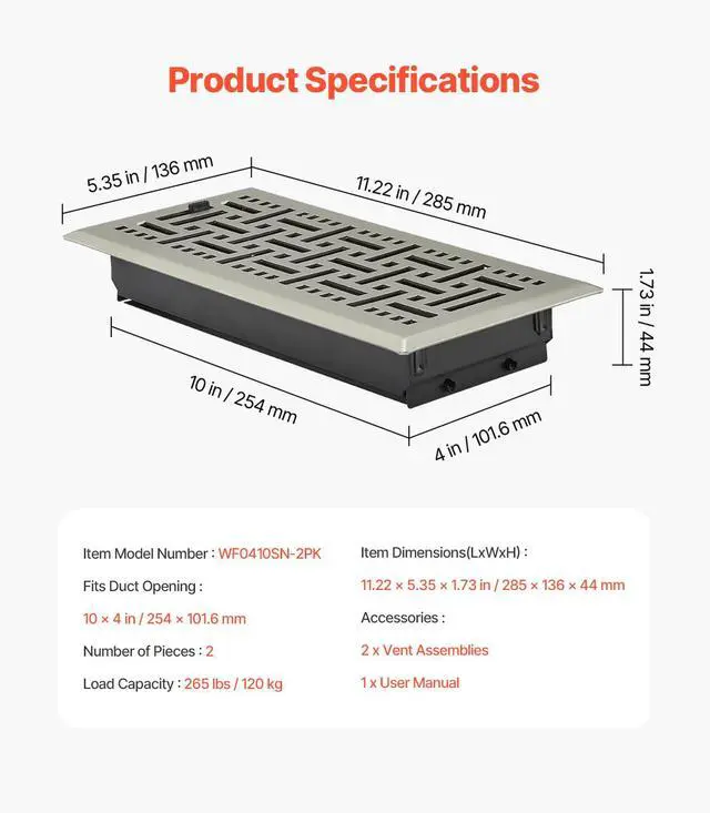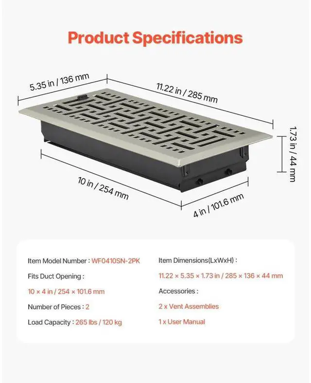Item Dimensions(LxWxH): 11.22 x 5.35 x 1.73 in / 285 x 136 x 44 mm,Number of Pieces: 2,Load Capacity: 265 lbs / 120 kg,Color: Nickel-Plated Dark Silver (Surface) & Black (Interior),Item Model Number: WF0410SN-2PK,Net Weight: 2.71 lbs / 1.23 kg,Fits Duct Opening: 10 x 4 in / 254 x 101.6 mm