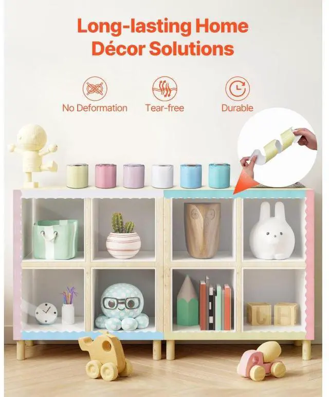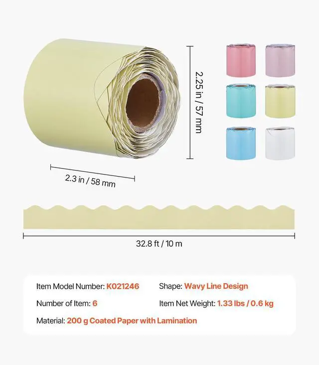 Item Dimensions (Rolled): 2.25 x 2.25 x 2.3 in / 57 x 57 x 58 mm,Shape: Wavy Line Design,Item Length (Unrolled): 32.8 ft / 10 m,Item Net Weight (6 Rolls): 1.33 lbs / 0.6 kg,Item Model Number: K021246,Material: 200 g Coated Paper with Lamination,Number of Items: 6
