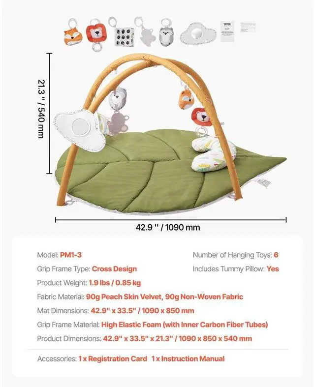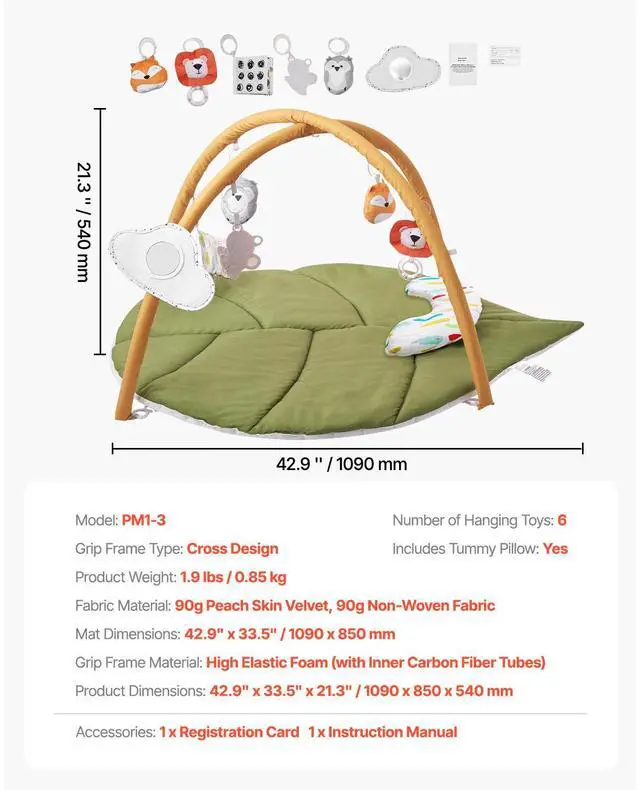 Number of Hanging Toys: 6,Item Model Number: PM1-3,Product Weight: 1.9 lbs / 0.85 kg,Mat Dimensions: 42.9 x 33.5 in / 1090 x 850 mm,Product Dimensions: 42.9 x 33.5 x 21.3 in / 1090 x 850 x 540 mm,Includes Tummy Pillow: Yes,Mat Material: 90g Non-Woven Fabric, 90g Peach Skin Velvet