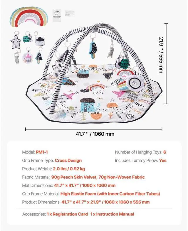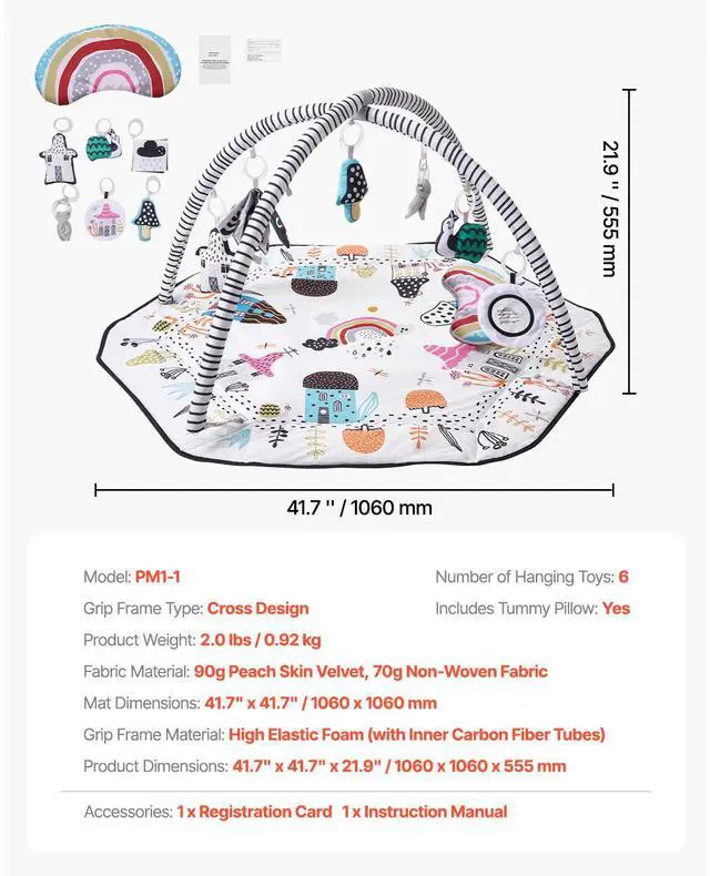 Number of Hanging Toys: 6,Item Model Number: PM1-1,Product Weight: 2.0 lbs / 0.92 kg,Mat Dimensions: 41.7 x 41.7 in / 1060 x 1060 mm,Include Tummy Pillow: Yes,Product Dimensions: 41.7 x 41.7 x 21.9 in / 1060 x 1060 x 555 mm,Mat Material: 90g Peach Skin Velvet, 70g Non-Woven Fabric
