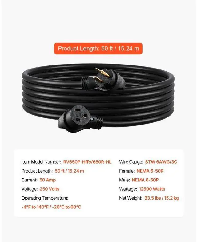 Operating Temperature: -4 to 140 / -20 to 60,Voltage: 250 Volts,Item Model Number: RV650P-H/RV650R-HL,Wattage: 12500 Watts,Product Length: 50 ft / 15.24 m,Female: NEMA 6-50R,Male: NEMA 6-50P,Current: 50 Amp,Wire Gauge: STW 6AWG/3C,Net Weight: 33.5 lbs / 15.2 kg