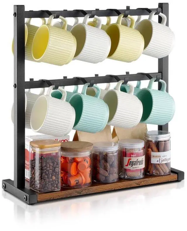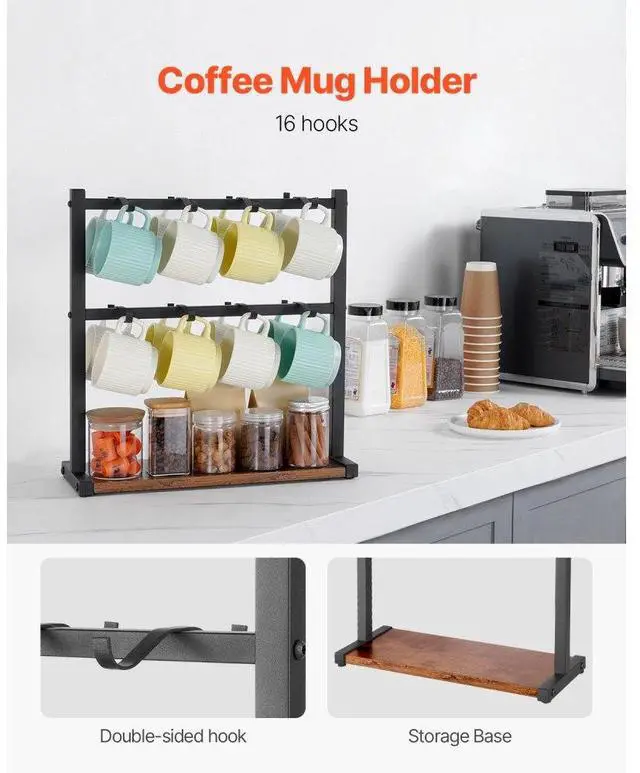 Coffee Mug Holder for Countertop 16 Hooks Cup Rack Wood Storage Base Organizer
