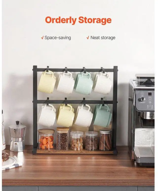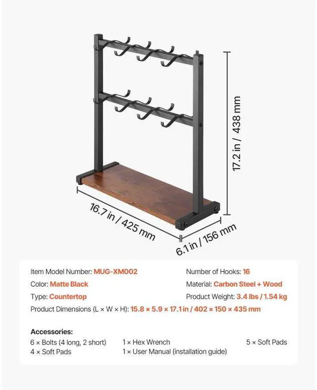 Type: Countertop,Color: Matte Black,Item Model Number: MUG-XM002,Product Weight: 3.4 lbs / 1.54 kg,Material: Carbon Steel + Wood,Number of Hooks: 16,Product Size: 16.7 x 6.1 x 17.2 in / 425 x 156 x 438 mm