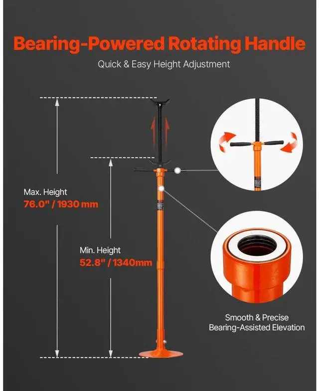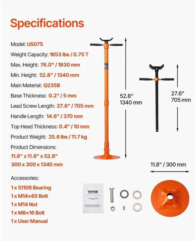 Handle Length: 14.6" / 370 mm,Top Head Thickness: 0.4" / 10 mm,Lead Screw Length: 27.6" / 705 mm,Weight Capacity: 1653.5 lbs / 0.75 t,Item Model Number: US075,Product Weight: 25.6 lbs / 11.7 kg,Maximum Height: 76.0" / 1930 mm,Product Dimensions: 11.8" x 11.8" x 52.8" / 300 x 300 x 1340 mm,Main Material: Q235B,Minimum Height: 52.8" / 1340 mm