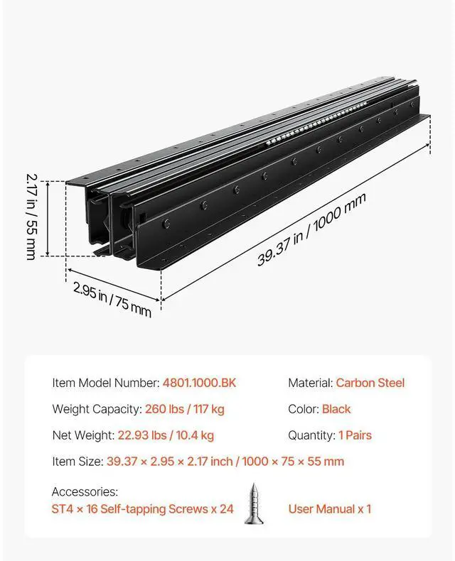 Weight Capacity: 260 lbs / 117 kg,Item Size: 39.37 x 2.95 x 2.17 inch / 1000 x 75 x 55 mm,Item Model Number: 4801.1000.BK,Quantity: 1 Pairs,Material: Carbon Steel,Net Weight: 22.93 lbs / 10.4 kg