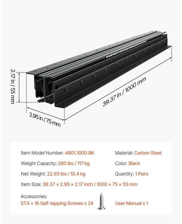 Weight Capacity: 260 lbs / 117 kg,Item Size: 39.37 x 2.95 x 2.17 inch / 1000 x 75 x 55 mm,Item Model Number: 4801.1000.BK,Quantity: 1 Pairs,Material: Carbon Steel,Net Weight: 22.93 lbs / 10.4 kg