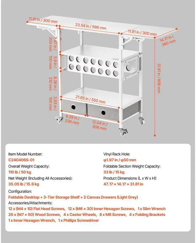 Net Weight (Including All Accessories): 35.05 lb / 15.9 kg,Configuration: Foldable Desktop + 3-Tier Storage Shelf + 2 Canvas Drawers (Light Grey),Side-Hanging Adhesive Roll: 0,Item Model Number: C240406S-01,Vinyl Rack Hole: 1.97 in / 50 mm,Overall Weight Capacity: 110 lb / 50 kg,Foldable Section Weight Capacity: 33 lb / 15 kg