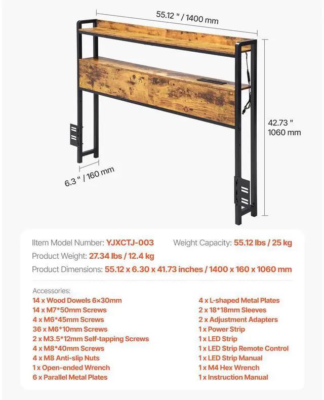 VEVOR Headboard for Full Size Bed, Adjustable Height Headboard with 2 Shelves Storage, Freestanding Head Board with Charging Station and LED Light for Different Bed Frames, Easy Assembly, Brown