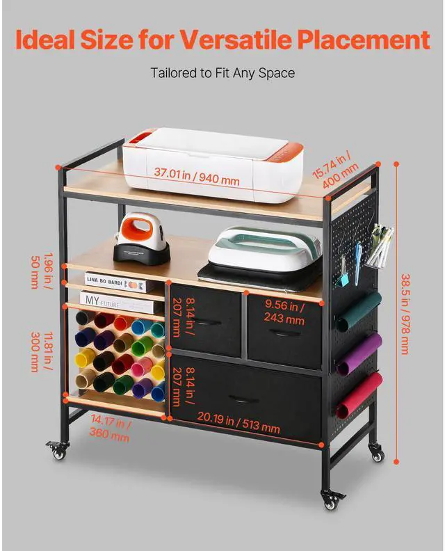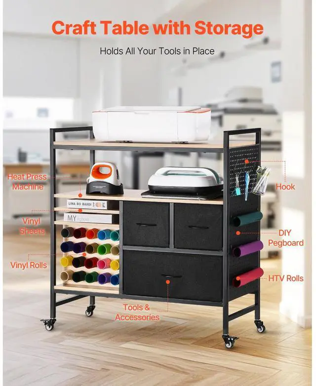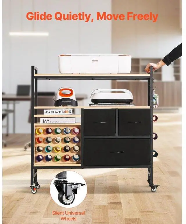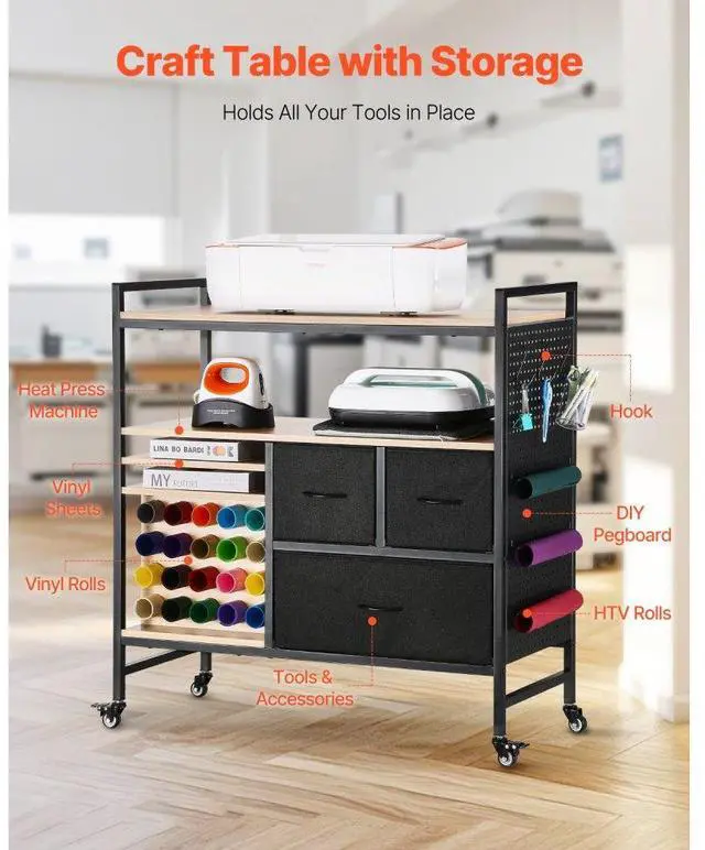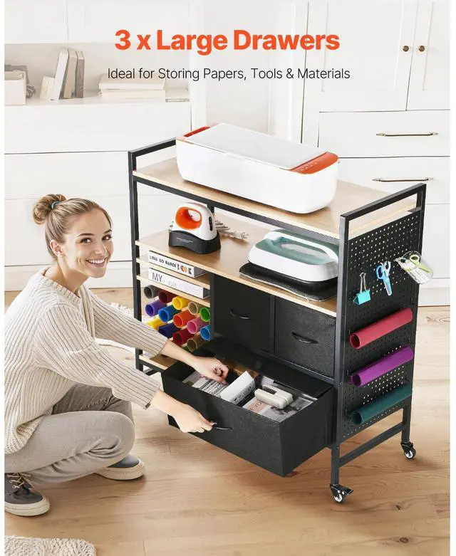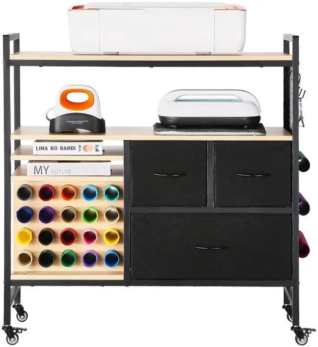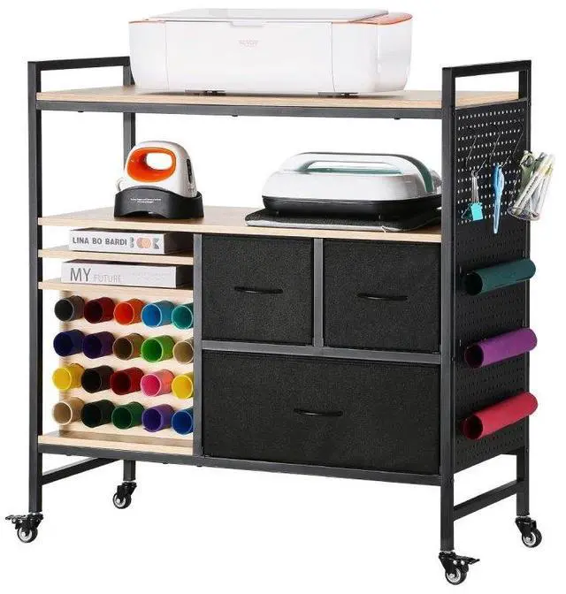 Rolling Craft Cart and Storage Table with 20 Vinyl Roll Holders 3 Drawers Black