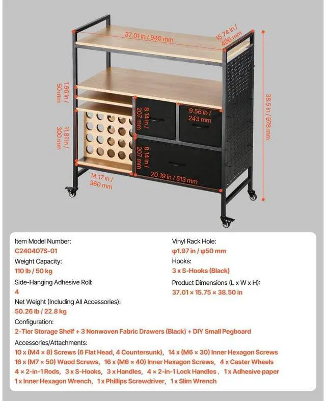 Net Weight (Including All Accessories): 50.26 lb / 22.8 kg,3 x S-Hooks (Black):,Configuration: 2-Tier Storage Shelf + 3 Nonwoven Fabric Drawers (Black) + DIY Small Pegboard,Weight Capacity: 110 lbs / 50 kg,Side-Hanging Adhesive Roll: 4,Item Model Number: C240407S-01,Vinyl Rack Hole: 1.97 in / 50 mm