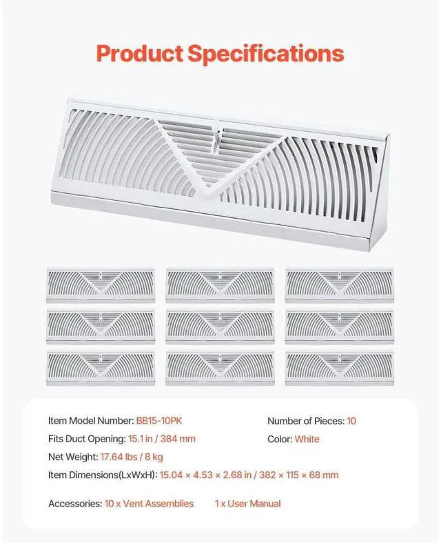 Item Dimensions(LxWxH): 15.04 x 4.53 x 2.68 in / 382 x 115 x 68 mm,Number of Pieces: 10,Color: White,Item Model Number: BB15-10PK,Net Weight: 17.64 lbs / 8 kg,Fits Duct Opening: 15.1 in / 384 mm