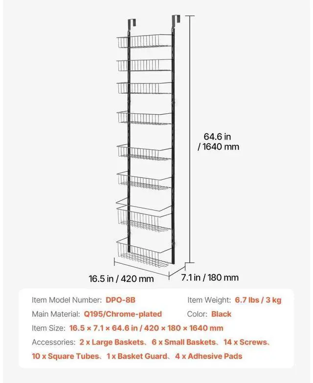Item Size: 16.5 x 7.1 x 64.6 in / 420 x 180 x 1640mm,Color: Black,Item Model Number: DPO-8B,Main Material: Q195/Chrome-plated,Item Weight: 6.7 lbs / 3 kg