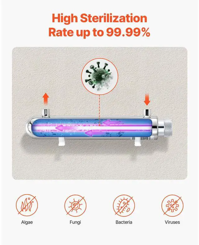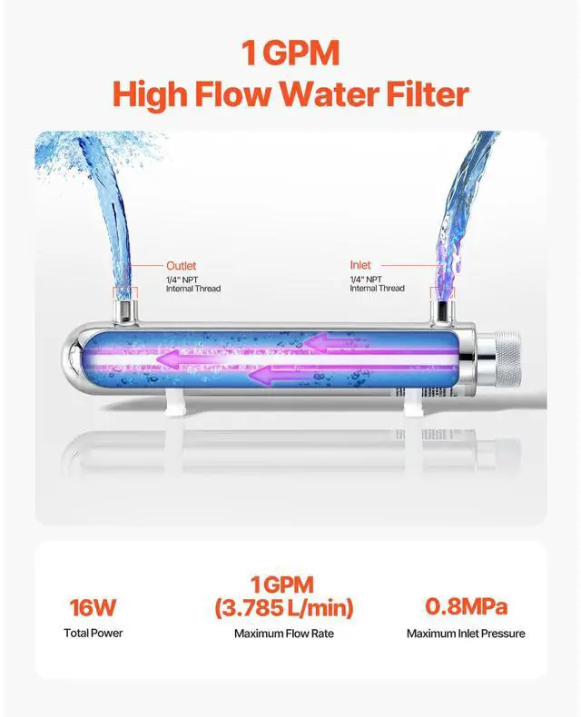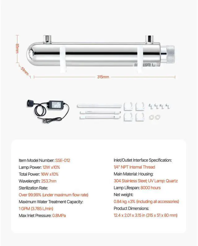 Lamp Power: 12W ±10%,Maximum Water Treatment Capacity: 1 GPM (3.785 L/min),Total Power: 16W ±10%,Item Model Number: SSE-012,Net weight: 1.85 lbs/0.84 kg (including all accessories),Max Inlet Pressure: 0.8MPa,Product Dimensions: 12.4 x 2.01 x 3.15 in/315 x 51 x 80 mm,Wavelength: 253.7nm,Sterilization Rate: Over 99.99% (under maximum flow rate),Main Material: Housing: 304 Stainless Steel; UV Lamp: Quartz,Lamp Lifespan: 8000 hours,Inlet/Outlet Interface Specification: 1/4" NPT Internal Thread