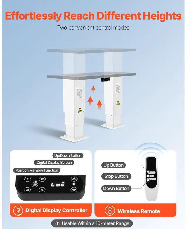 Load Capacity of Dual Column: 260 lbs / 120 kg,Single Column Width: 144 mm / 134 mm / 122.5 mm From Top to Bottom,Color: Silver,Item Model Number: IPTT-DD-DL-360-H,Product Weight: 43 lbs / 19.5 kg,Lift Height: 14.2-31.1 in / 360-790 mm,Tabletop Size of Single Column: 7.9 x 7.9 in / 200 x 200 mm,Main Material: Aluminum Alloy + Steel Plate