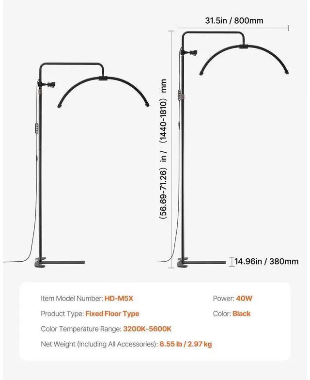 Net Weight (Including All Accessories): 6.55 lb / 2.97 kg,Product Type: Fixed Floor Type,Color: Black,Item Model Number: HD-M5X,Color Temperature Range: 3200K-5600K,Power: 40W
