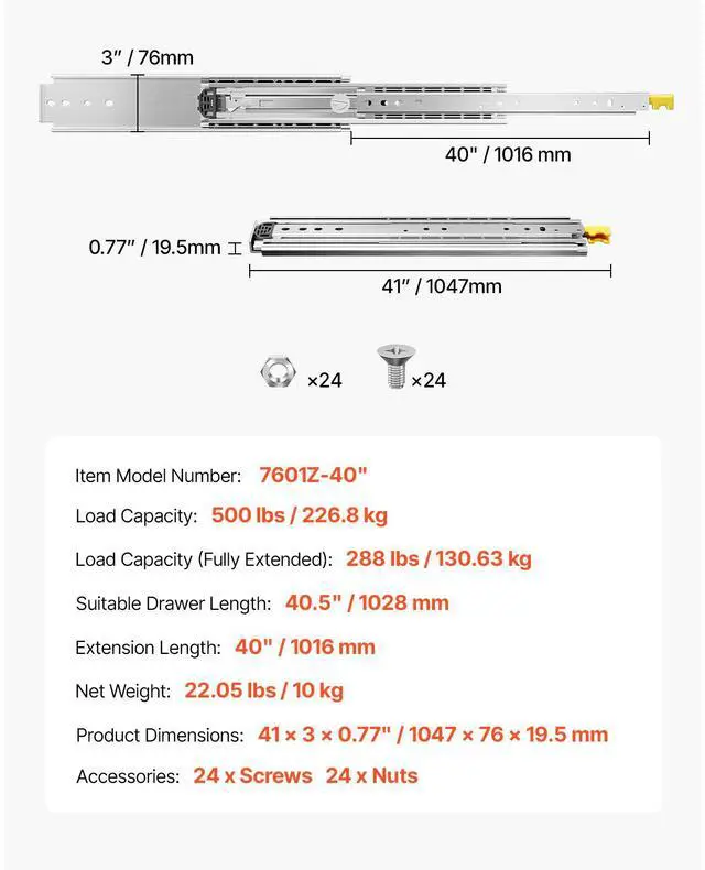 Suitable Drawer Length: 40.5" / 1028 mm,Extension Length: 40" / 1016 mm,Load Capacity: 500 lbs / 226.8 kg,Item Model Number: 7601Z-40",Product Dimensions: 41 x 3 x 0.77" / 1047 x 76 x 19.5 mm,Load Capacity (Fully Extended): 288 lbs / 130.63 kg,Net Weight: 22.05 lbs / 10 kg