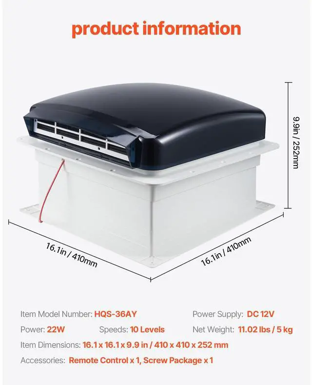 Control Method: Panel + Remote Control,Color: Smoke,Fan Blade: 12 in / 30.5 cm,Power Supply: DC 12V,Speeds: 10 Levels,Item Model Number: HQS-36AY,Opening Method for the Top Cover: Electric,Rain Sensor Function: Yes,Item Dimensions: 16.1 x 16.1 x 9.9 in / 410 x 410 x 252 mm,Net Weight: 11.02 lbs / 5 kg,Power: 22W,Opening Size: 14 x 14 in / 35.6 x 35.6 cm,Main Material: HIPS 476L + PC 1100