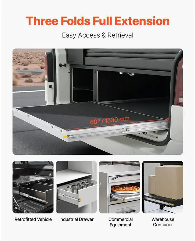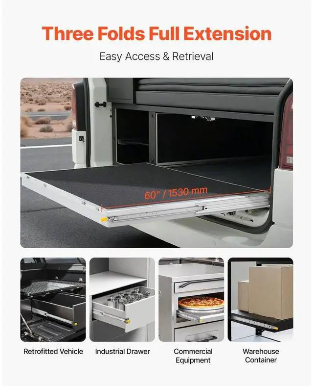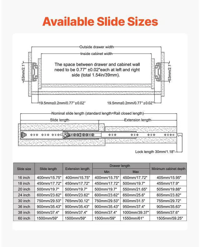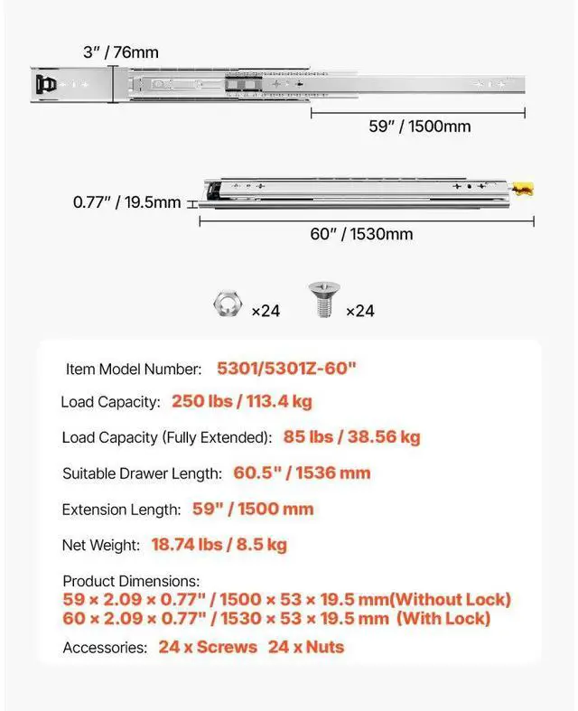 Suitable Drawer Length: 60.5" / 1536 mm,Extension Length: 59" / 1500 mm,Load Capacity: 250 lbs / 113.4 kg,Item Model Number: 5301/5301Z-60",Product Dimensions: 59 x 2.09 x 0.77" / 1500 x 53 x 19.5 mm (Without Lock), 60 x 2.09 x 0.77" / 1530 x 53 x 19.5 mm (With Lock),Load Capacity (Fully Extended): 85 lbs / 38.56 kg,Net Weight: 18.74 lbs / 8.5 kg