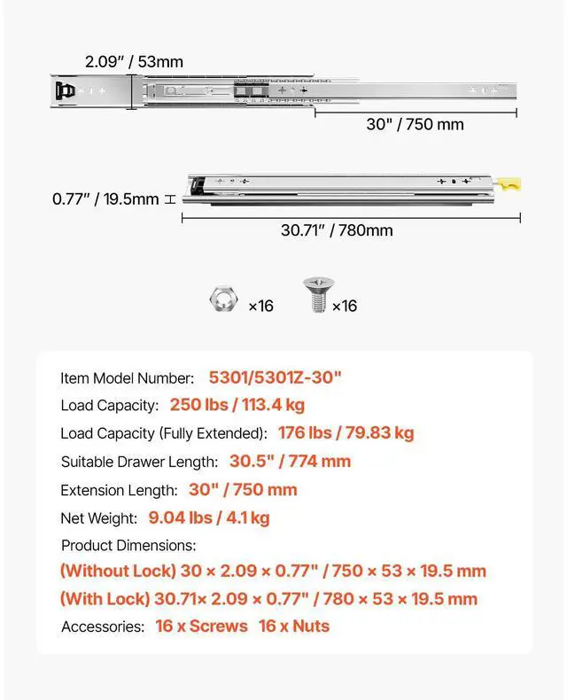 Suitable Drawer Length: 30.5" / 774 mm,Extension Length: 30" / 750 mm,Load Capacity: 250 lbs / 113.4 kg,Item Model Number: 5301/5301Z-30",Product Dimensions: 30 x 2.09 x 0.77" / 750 x 53 x 19.5 mm (Without Lock), 30.71 x 2.09 x 0.77" / 780 x 53 x 19.5 mm (With Lock),Load Capacity (Fully Extended): 176 lbs / 79.83 kg,Net Weight: 9.04 lbs / 4.1 kg