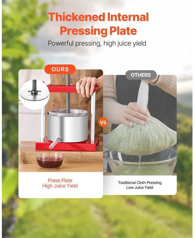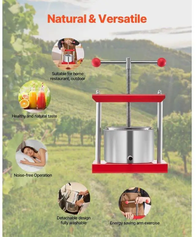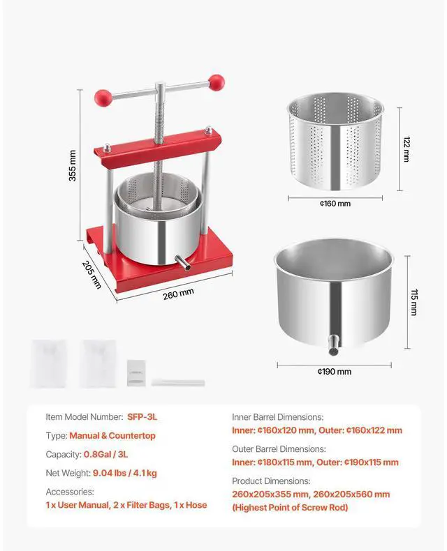 Type: Manual & Countertop,Capacity: 0.8 Gal / 3L,Item Model Number: SFP-3L,Outer Barrel Dimensions: Inner: ¢180x115 mm, Outer: ¢190x115 mm,Product Dimensions: 260x205x355 mm, 260x205x560 mm (Highest Point of Screw Rod),Inner Barrel Dimensions: Inner: ¢160x120 mm, Outer: ¢160x122 mm,Net Weight: 9 lbs / 4.1 kg