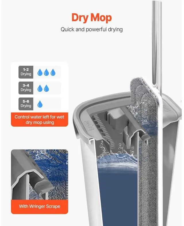 VEVOR Mop and Bucket with Wringer Set, Wet & Dry Use, Flat Mop and Bucket System with 3 Washable Microfiber Pads, Flat Mop with Stainless Steel Handle, Mop Bucket Set for Hardwood Tile Vinyl
