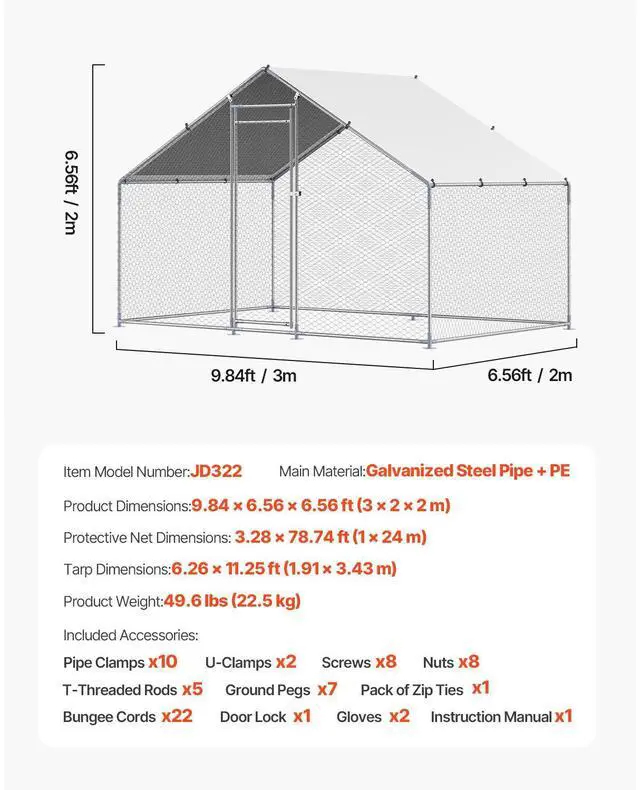Tarp Dimensions: 6.26 x 11.25 ft (1.91 x 3.43 m),Protective Net Dimensions: 3.28 x 78.74 ft (1 x 24 m),Item Model Number: JD322,Product Weight: 49.6 lbs (22.5 kg),Product Dimensions: 9.84 x 6.56 x 6.56 ft (3 x 2 x 2 m),Main Material: Galvanized Steel Pipes + PE