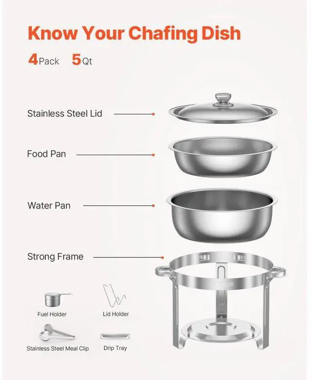 Food Pan Capacity: 5Qt / 4.7L,Water Pan Capacity: 7Qt / 6.6L,Color: Silver,Item Model Number: JZYYXCL5LGG4,Product Weight: 22.5 lbs / 10.2 kg ±5 %,Quantity: 4,Material: Stainless Steel,Heating Method: Fuel