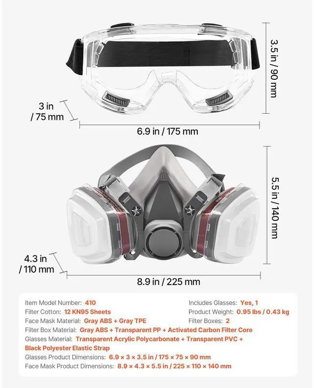 Includes Glasses: Yes, 1,Filter Cotton: 12 KN95 Sheets,Face Mask Product Dimensions: 8.9 x 4.3 x 5.5 inch / 225 x 110 x 140 mm,Glasses Material: Transparent Acrylic Polycarbonate + Transparent PVC + Black Polyester Elastic Strap,Filter Box Material: Gray ABS + Transparent PP + Activated Carbon Filter Core,Glasses Product Dimensions: 6.9 x 3 x 3.5 inch / 175 x 75 x 90 mm,Item Model Number: 410,Product Weight: 1.05 lbs / 0.475 kg,Filter Boxes: 2,Face Mask Material: Gray ABS + Gray TPE