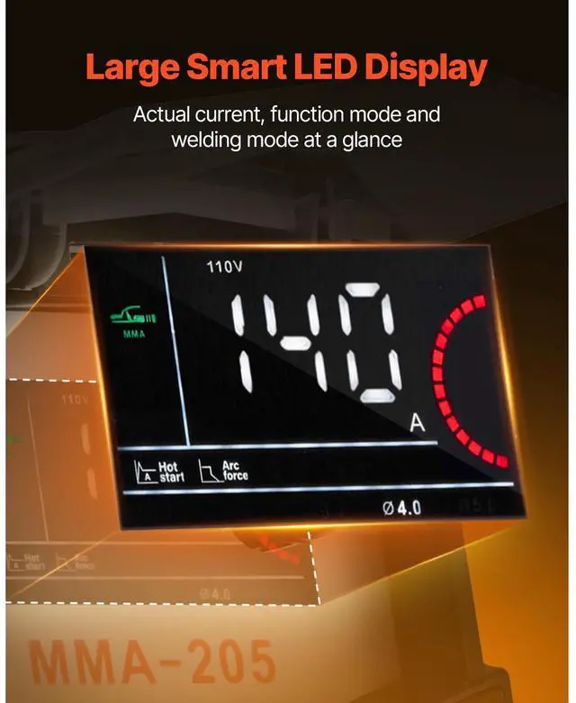 Type: IGBT,Welding Thickness: 10 mm,Load Ratio: 20% at 40°C Ambient Temperature,Item Model Number: MMA-205,Net Weight: 15.2 lbs / 6.9 kg,Main Material: Plastic Shell + Cold-rolled Steel Q235,Product Size: 15.0 x 6.3 x 12.6 in / 380 x 160 x 320 mm