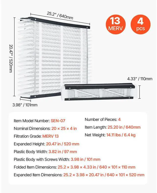 Folded Item Dimensions(LxWxH): 25.20 x 3.98 x 4.33 in / 640 x 101 x 110 mm,Nominal Dimensions: 20 x 25 x 4 in,Filtration Grade: MERV 13,Plastic Body with Screws Width: 3.98 in / 101 mm,Number of Pieces: 4,Expanded Height: 20.47 in / 520 mm,Item Model Number: SEN-07,Item Length: 25.20 in / 640 mm,Plastic Body Width: 3.82 in / 97 mm,Net Weight: 14.11 lbs / 6.4 kg,Expanded Item Dimensions(LxWxH): 25.20 x 3.98 x 20.47 in / 640 x 101 x 520 mm