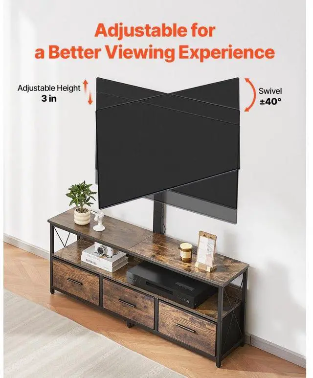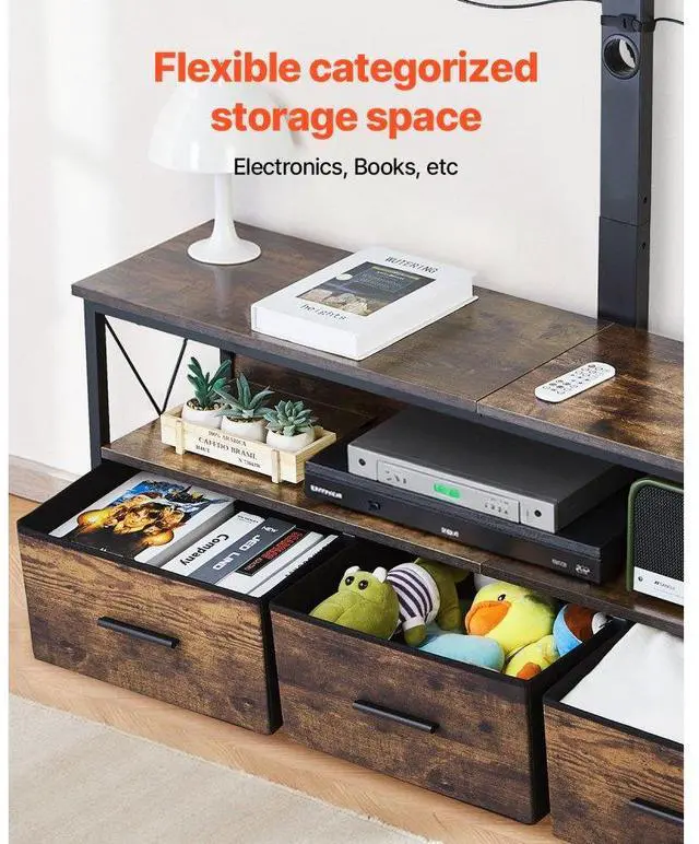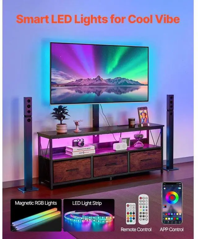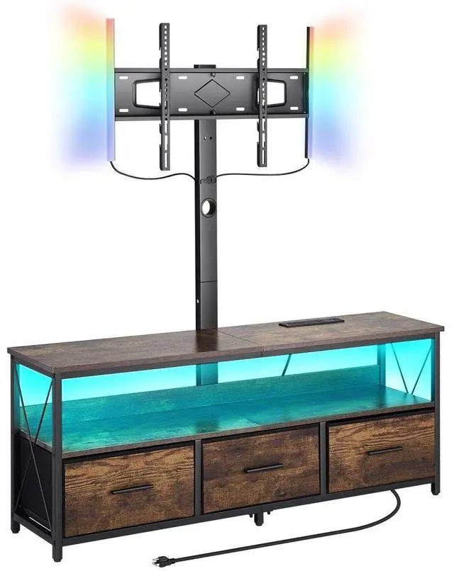VEVOR 52" TV Stand with Mount for up to 75 in TVs, Entertainment Center with Power Outlet & LED Lights, Height Adjustable TV Console with Mount with 3 Drawers for Bedroom, Living Room, Brown